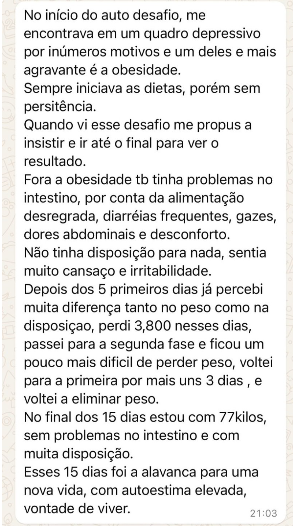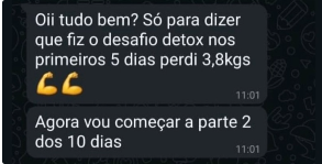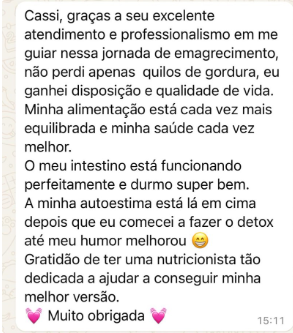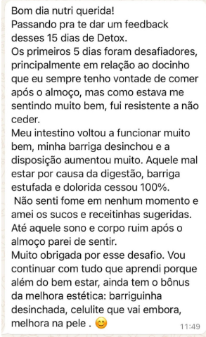 Estruturei o seu detox para ajudar te ajudar a emagrecer, desinflamar, mudar hábitos, regular o intestino, desinchar e melhorar a autoestima. São 15 dias descomplicados em busca de sua melhor versão. Vem comigo!